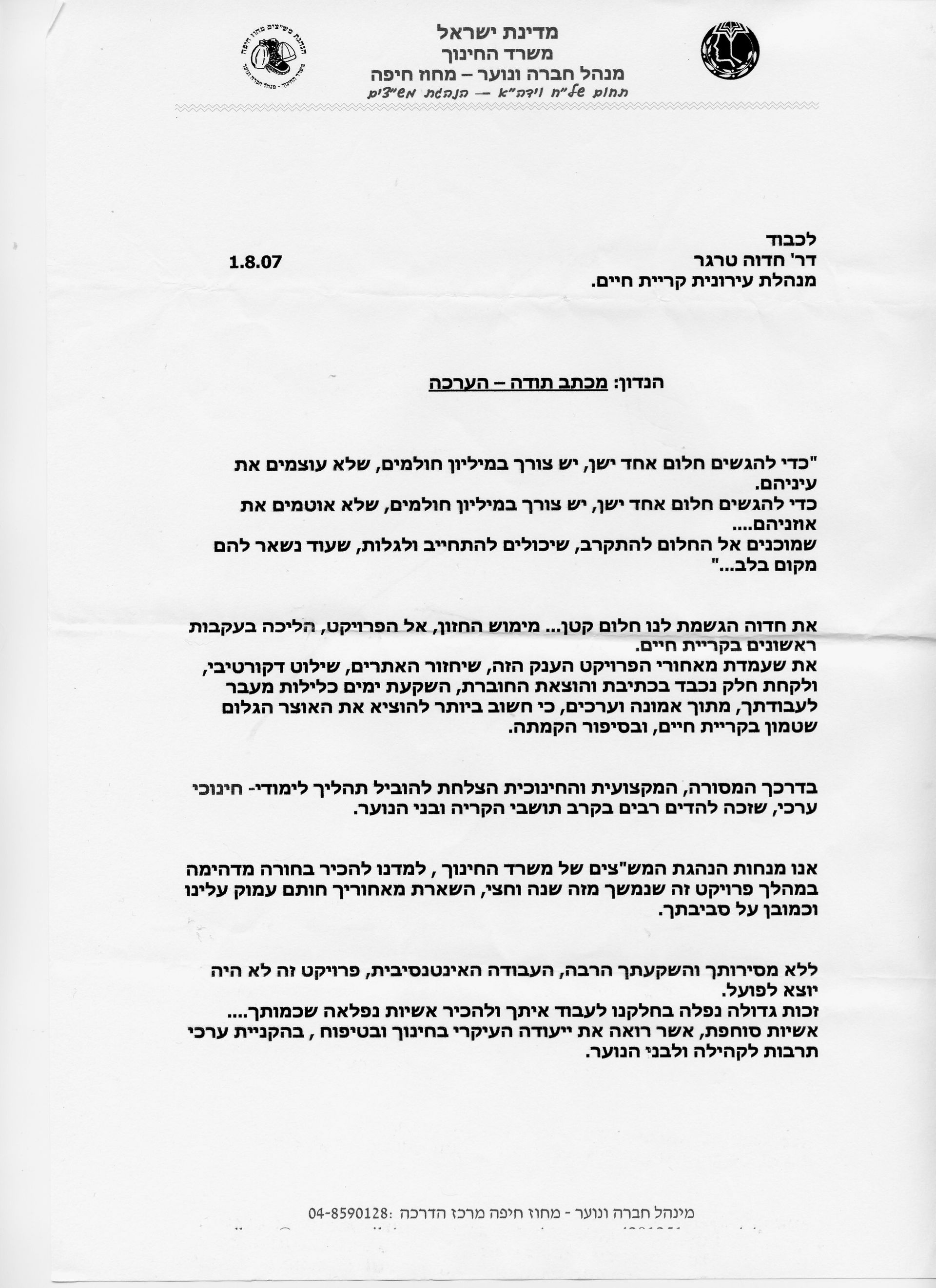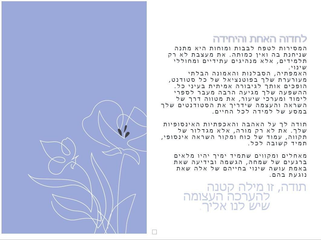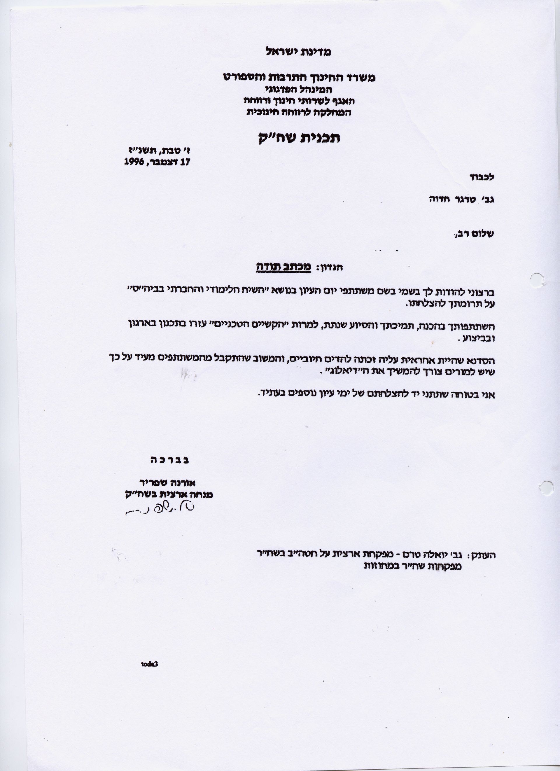 הסדנאות של ד"ר טרגר נתנו לי כלים חדשים לשיפור ההוראה ולשיתוף פעולה טוב יותר עם ההורים. אני רואה את השינוי בכיתה ומודה על ההדרכה המקצועית."
